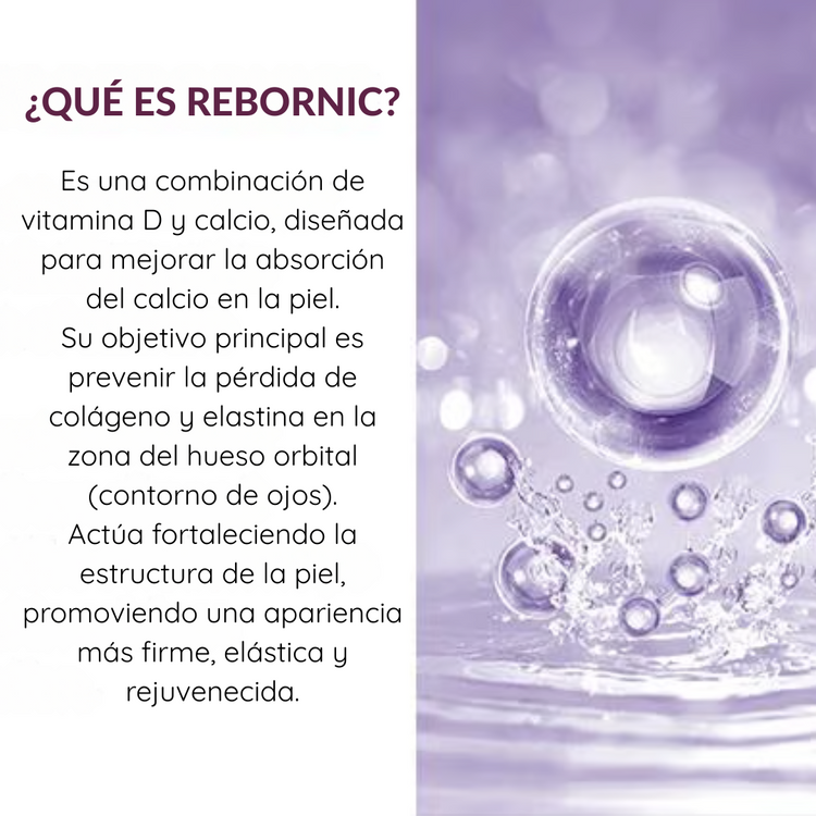 Su fórmula contiene el innovador complejo REBORNIC™ (Vitamina D + Calcio), diseñado para fortalecer la estructura de la piel y estimular la producción de colágeno y elastina. El resultado: un contorno de ojos más liso, firme y luminoso en cada aplicación.